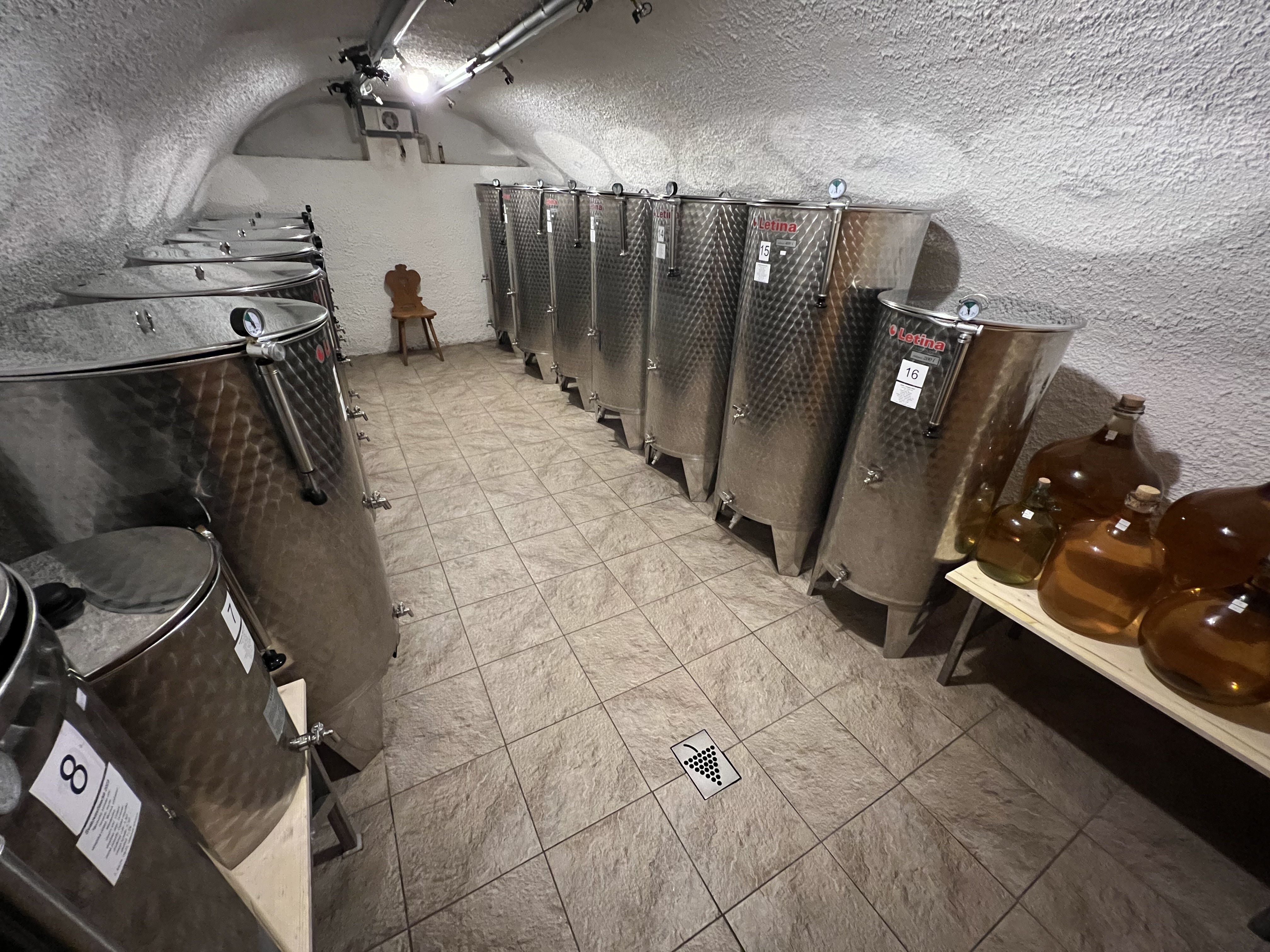 Vinný sklepNáš 40 let starý vinný sklep pojme cca 8 tisíc litrů vína. V roce 2022 proběhla částečná rekonstrukce sklepa, začali jsme od nové podlahy a pokračovali výměnou starých dřevěných sudů na víno za moderní nerezové nádoby. |